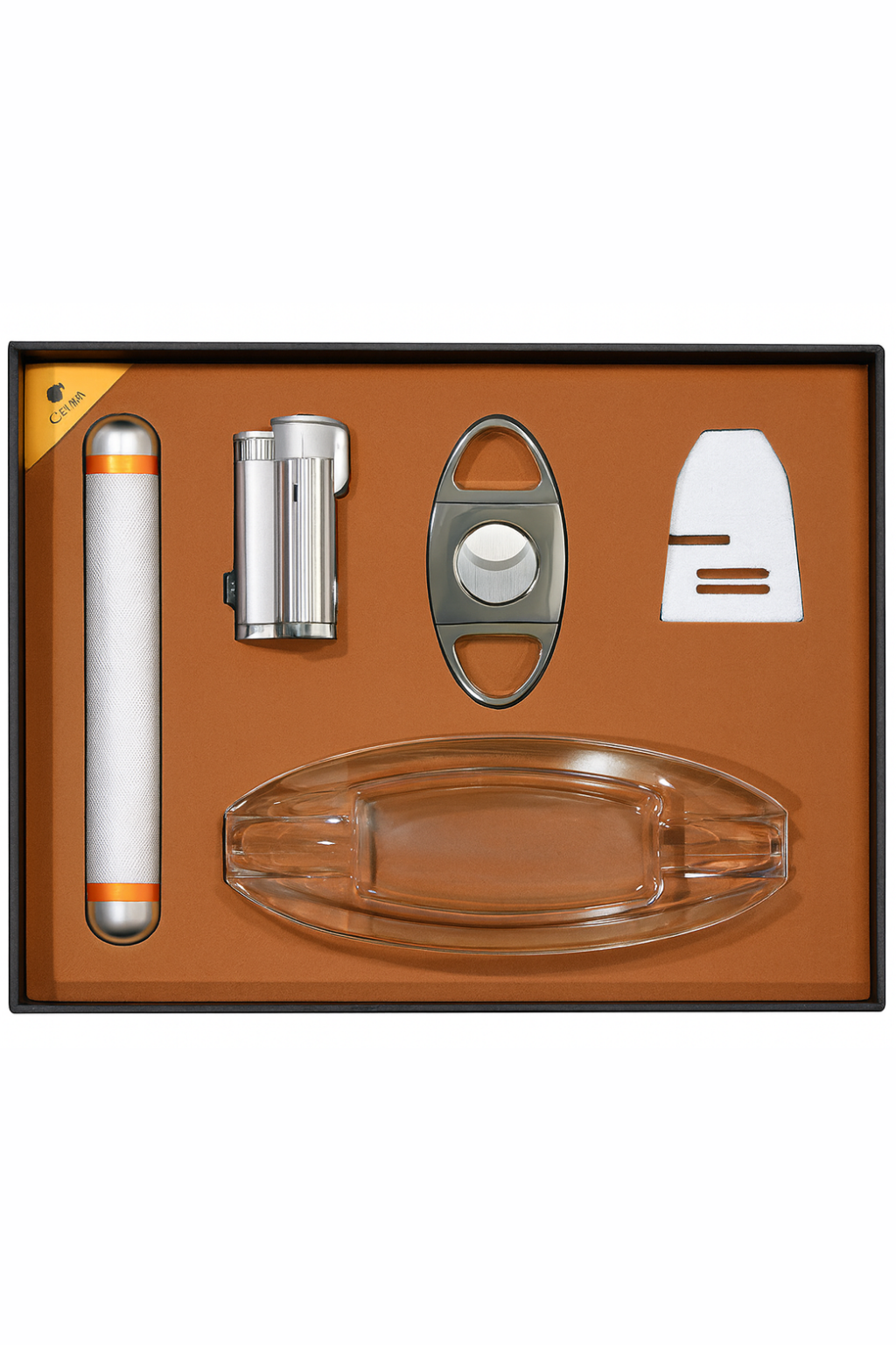 🟡 Set İçeriği✅ Cohiba marka puro tüpü (tek puro taşıma için)✅ Jet alevli puro çakmağı✅ Paslanmaz çelik puro kesici✅ Cam puro küllüğü✅ Puro standı (taşınabilir ve pratik kullanım için)
