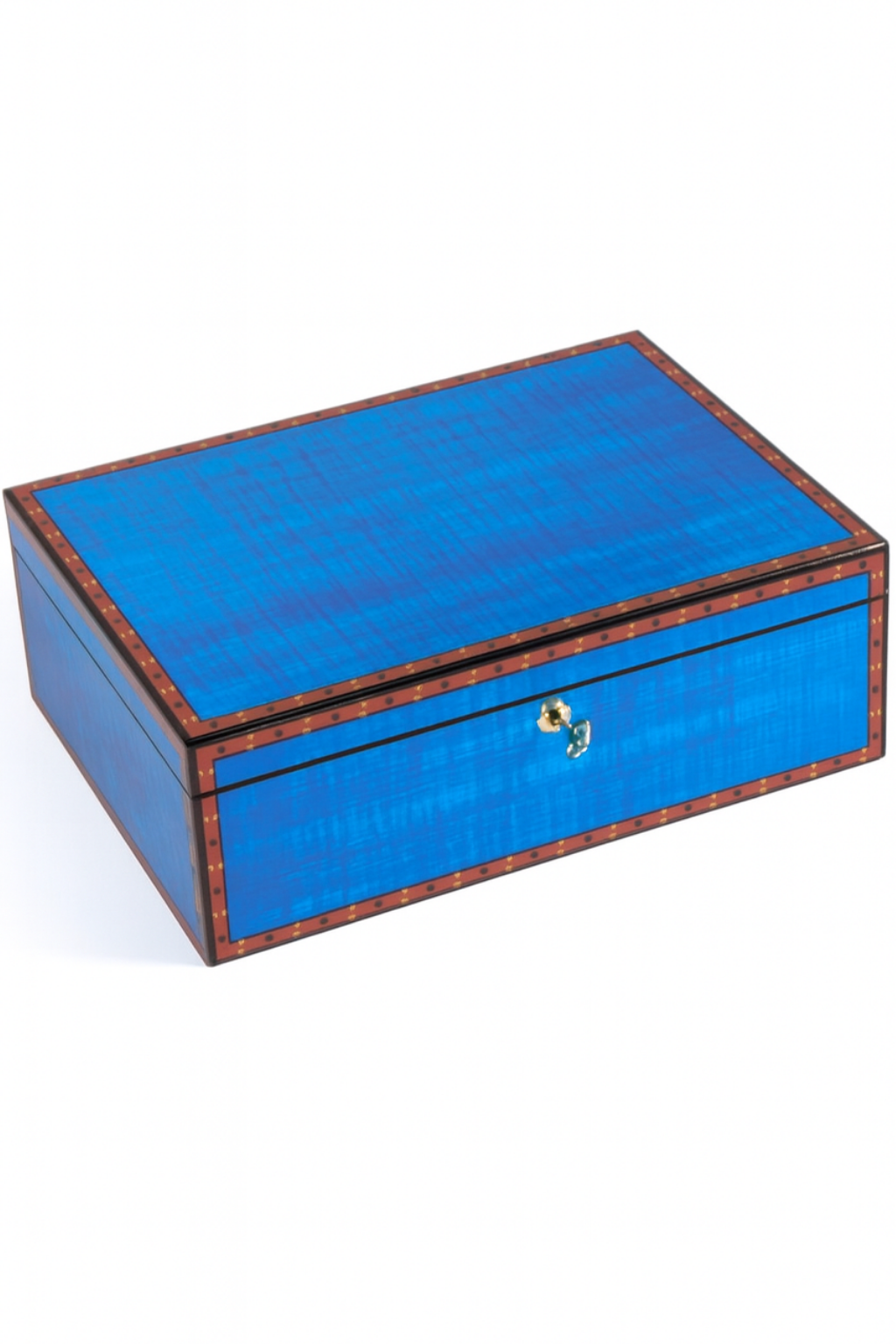 Göz alıcı mavi lake dış yüzeyi ve kontrast bordür detaylarıyla Parmida PHUM0160 humidor, purolarınızı güvenle saklarken bulunduğu ortama şıklık katar. İç kısmı sedir ağacı kaplıdır ve puroların taze kalmasını sağlar.
