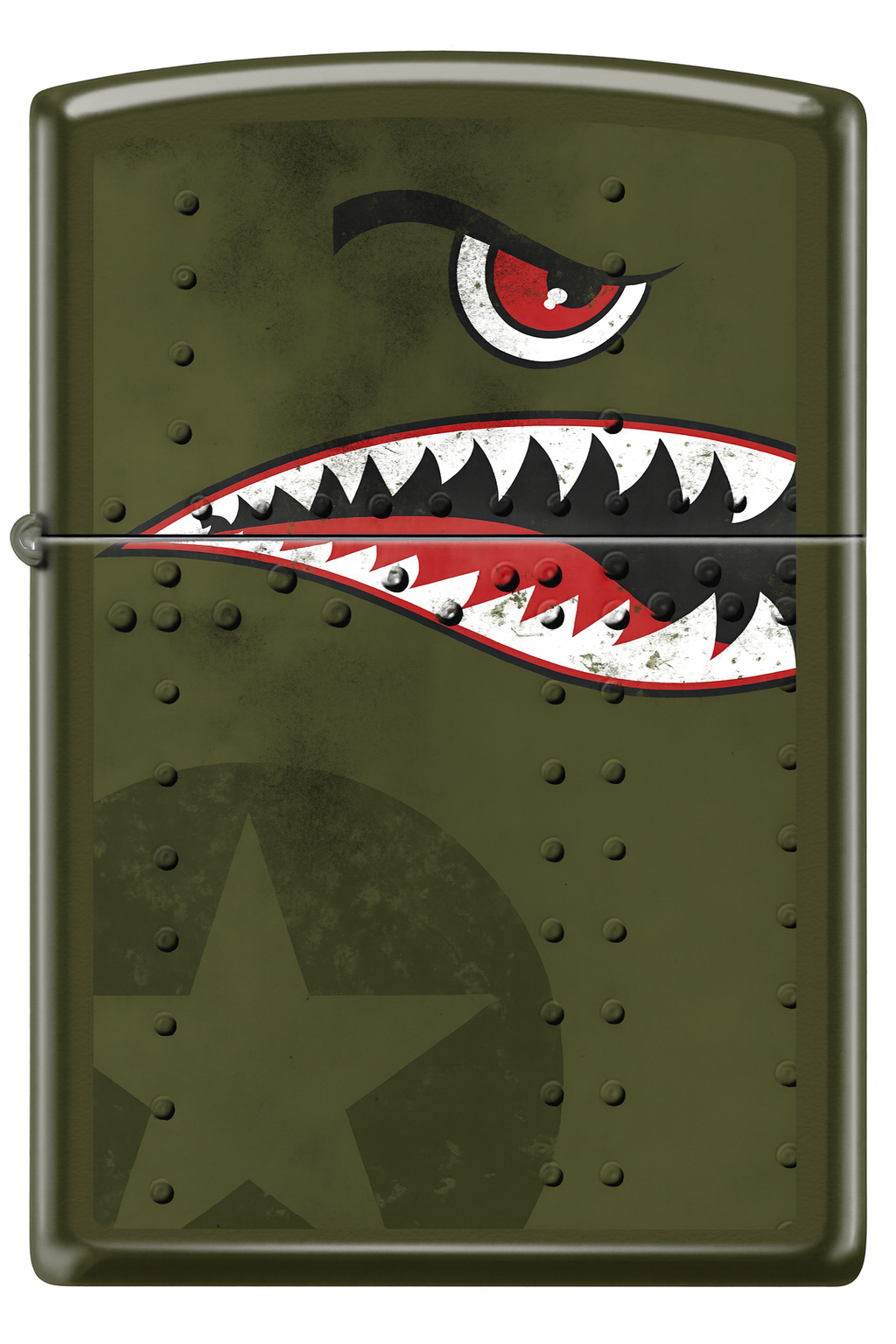 🟡 Ürün AçıklamasıZippo’nun ikonik kalitesiyle üretilmiş bu özel tasarım çakmak, 2. Dünya Savaşı döneminin savaş uçaklarında yer alan “Nose Art” grafikleriyle dikkat çekiyor. Mat asker yeşili yüzey üzerinde agresif köpekbalığı dişi ve keskin bakış detaylarıyla koleksiyonluk bir parça olmasının yanında günlük kullanıma da uygundur. Zippo’nun efsanevi rüzgar geçirmez tasarımıyla her koşulda güvenilir kullanım sağlar.